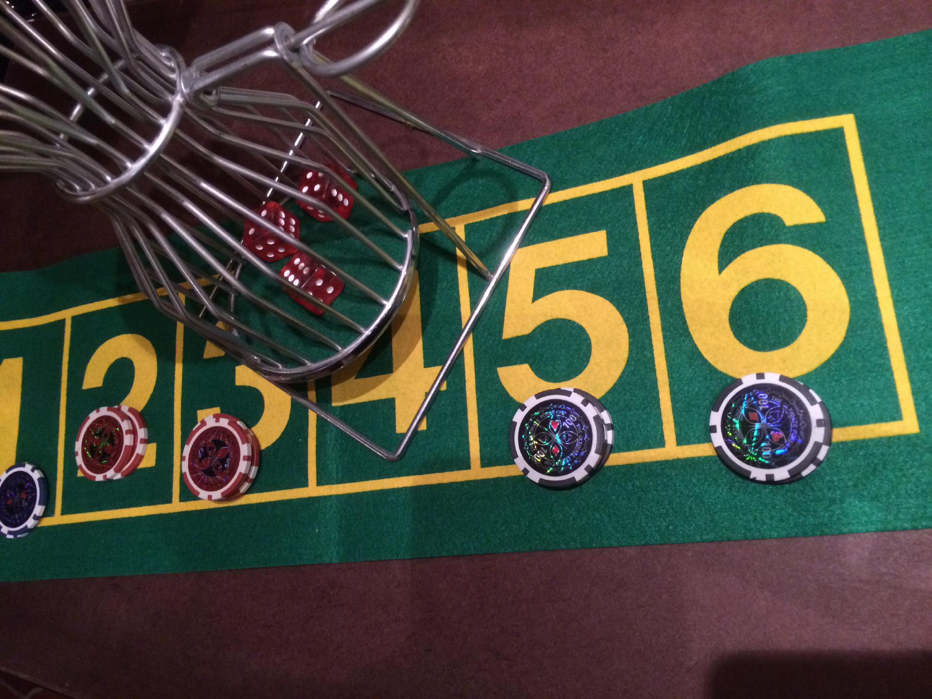 Chuck-A-Luck ist ein lebhaftes Spiel, bei dem drei Würfel in einem drehbaren Käfig gemischt werden. Gewettet wird auf die Augenzahl. Hat ein Spieler auf eine richtige Zahl gesetzt, gewinnt er den doppelten, bei zwei richtigen Zahlen den zweifachen und bei drei richtigen Zahlen den dreifachen Einsatz. Zeigt kein Würfel auf eine gesetzte Zahl, so ist der Einsatz verloren.